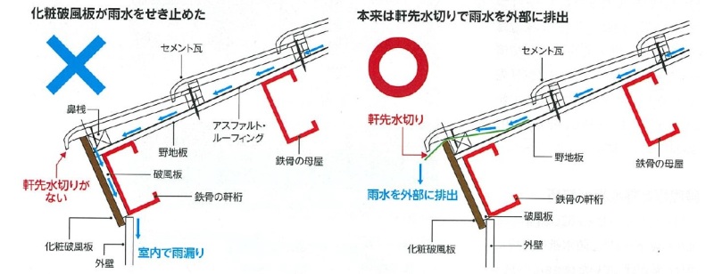セメント瓦に侵入した雨水は軒先水切りの上を流れ、化粧破風板の上を
