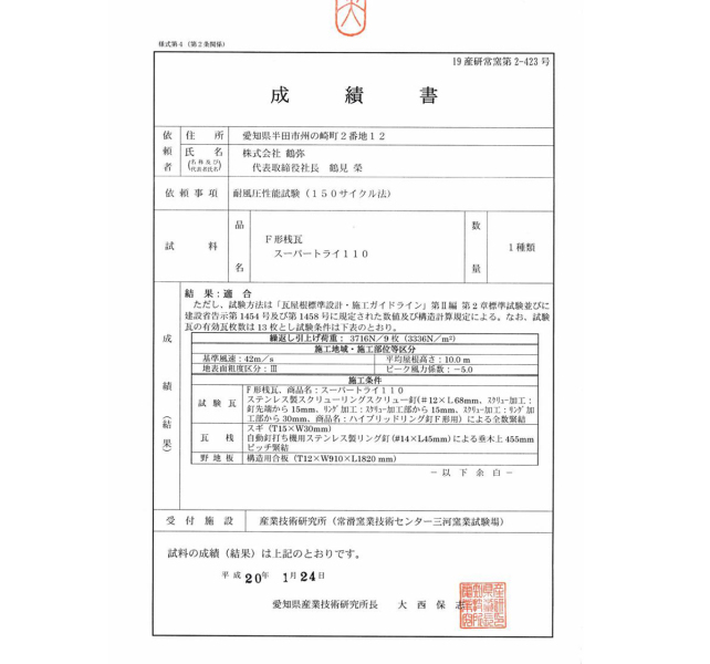 佃:例えば、瓦メーカーの株式会社鶴弥が出している成績書だと、愛知県産業技術研究所で、屋根材がF形桟瓦スーパートライ110で、接合部のステンレス製スクリューリングスクリュー釘(#12×68mm)として使われて、成績結果として「適合」と記載されていますね。
