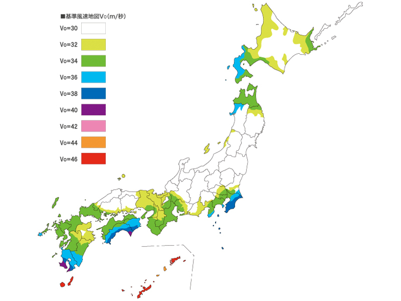 佃:建物の住所によって風速が強い箇所だと、例えば沖縄だと風速46(m/s)ですね。法律上決められています。通常は風速30(m/s)が多いかと思います。余談ですが、基準風速は過去の台風の記録に基づいて決められているものです。風は台風と思ってもらっても良いかもしれません。