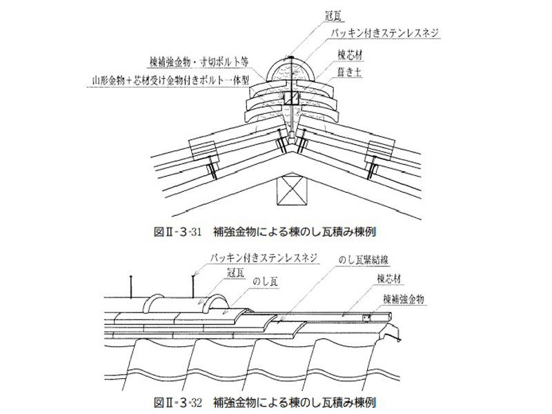 イ:上記は瓦屋根のガイドラインの一部ですが、以前は瓦の頂点(棟部)には補強金物を入れていなかったのですが、現在はガイドライン工法と言われる施工方法では補強金物を入れる形になっています。これが先ほど佃先生がおっしゃっていた留め付け方法の話ですよね?