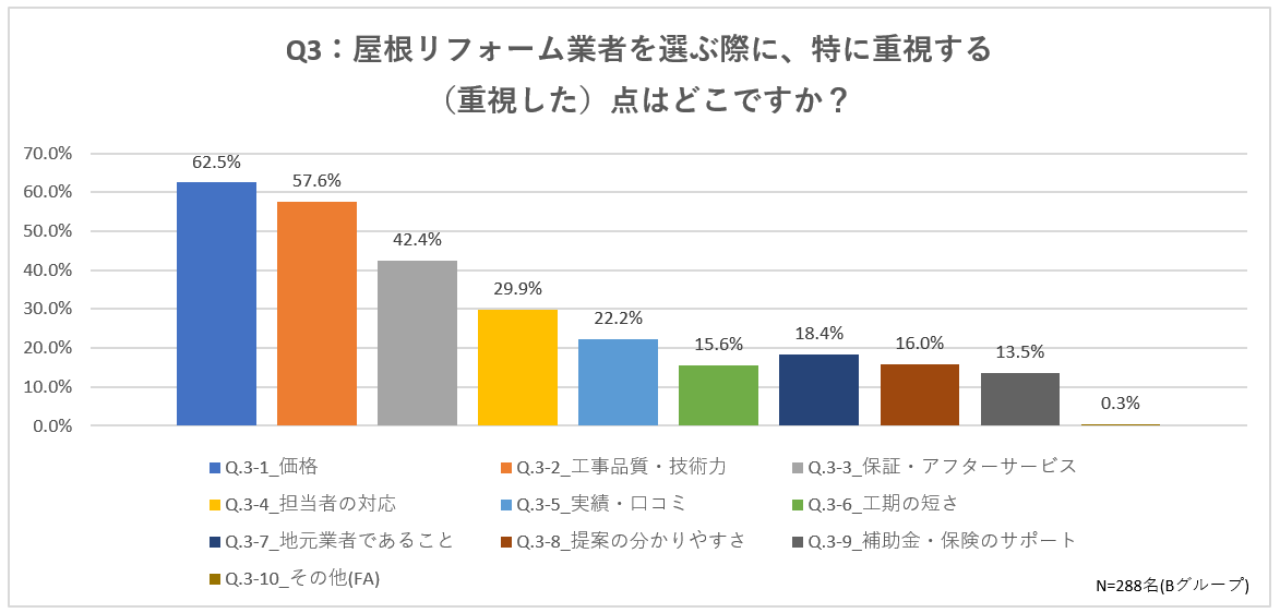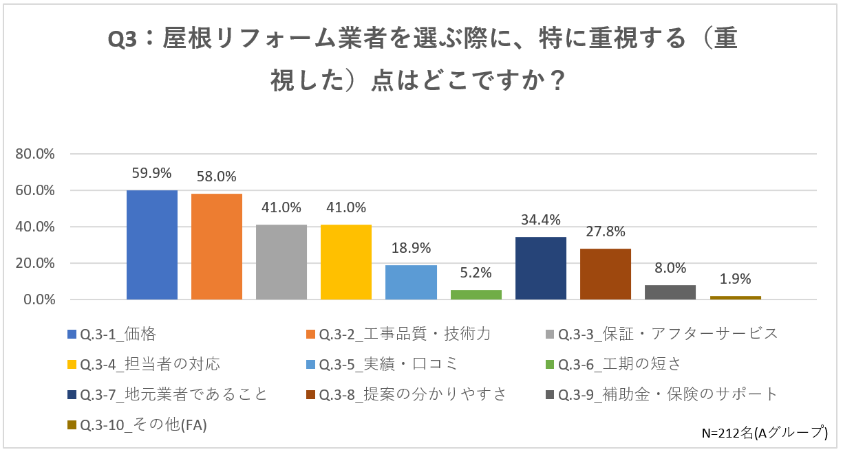 屋根リフォーム業者を選定する際に、特に重視する(重視した)点として、最も高い割合を示したのは「価格(Q.3-1)」で59.9%、次いで「工事品質・技術力(Q.3-2)」が58.0%と、費用対効果に対する意識が非常に高いことがわかります。