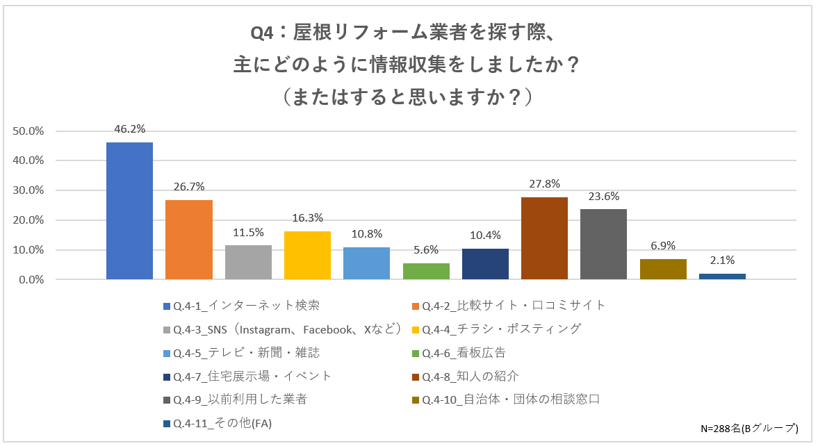 屋根リフォーム業者を探す際の情報収集方法として最も多かったのは「インターネット検索(Q.4-1)」(46.2%)で、全体の約半数近くがWeb検索を活用していることが明らかとなりました。これは、能動的な情報収集手段としてインターネットが定着している現状を反映しています。