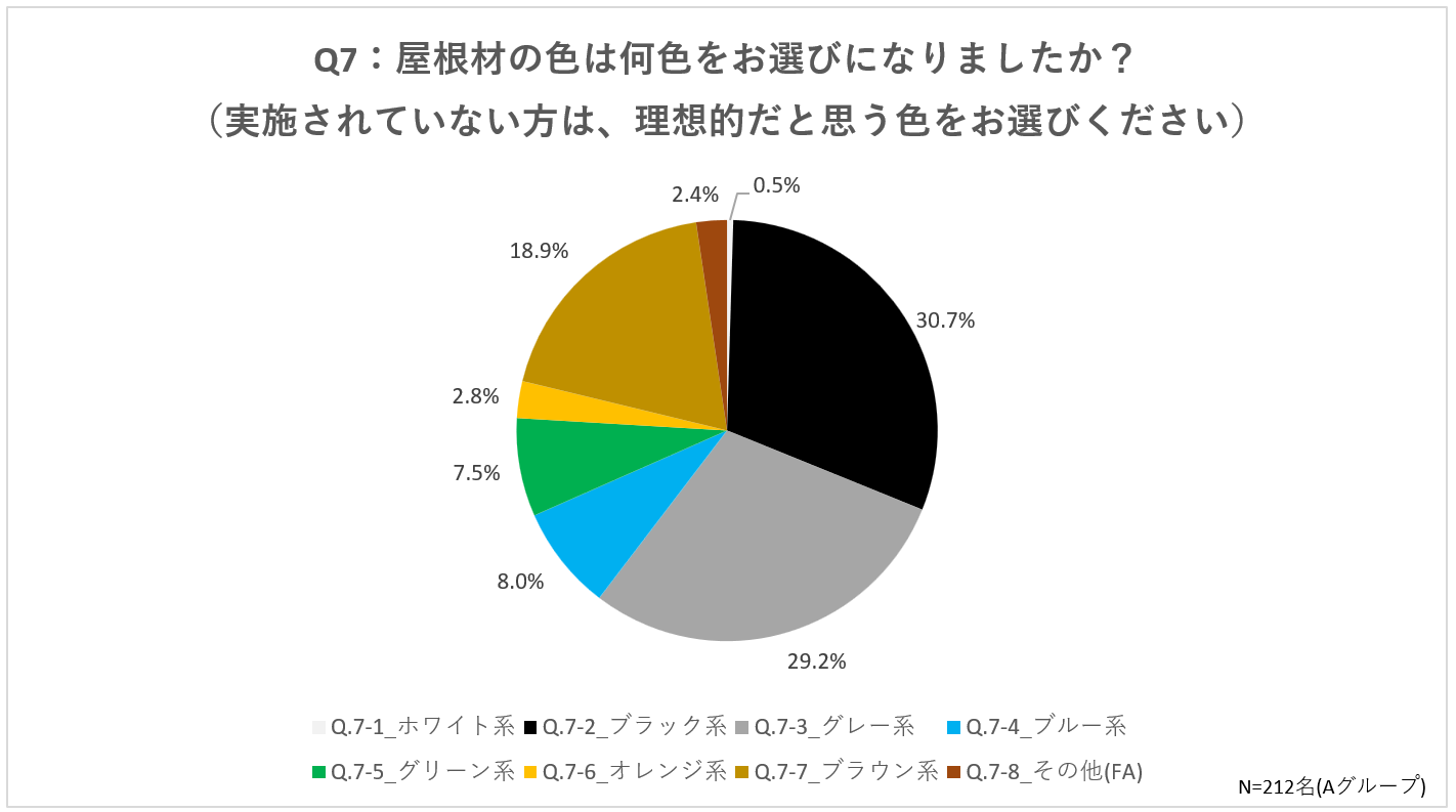 屋根リフォームにおける屋根材の色で最も人気があったのは「ブラック系(Q.7-2)」で、30.7%と全体の約3割を占めています。次いで「グレー系(Q.7-3)」が29.2%とほぼ同水準で続いており、これらの結果から、落ち着いた無彩色の濃淡カラー(ブラック・グレー)が全体の6割を超えて支持されていることが分かります。