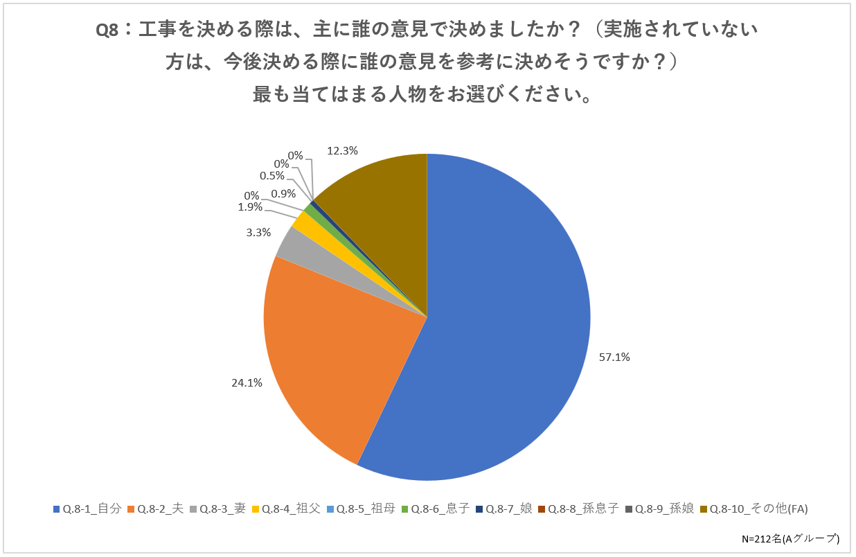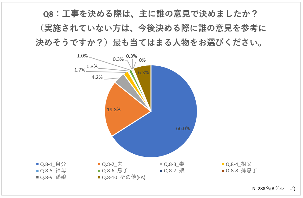 工事の意思決定において、最も多かったのは「自分(Q8.1)」と回答した人で、全体の66.0%を占めました。次いで多かったのは「夫(Q8.2)」が19.8%で、この2種類で85%以上を占めています。