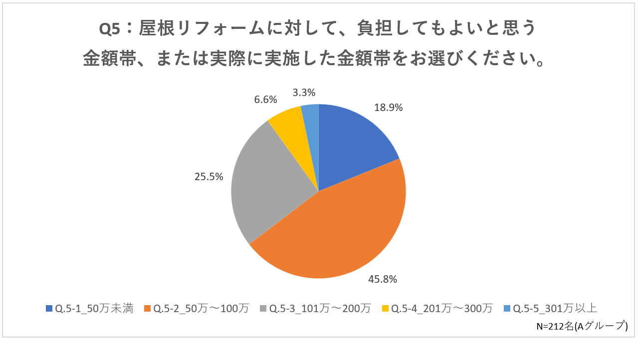 屋根リフォームに対して、負担してもよいと思う金額帯、または実際に実施した金額帯で最も多かったのは「50万〜100万円(Q.5-2)」で、全体の45.8%を占めています。次に多かったのが「101万〜200万円(Q.5-3)」で25.5%、続いて「50万円未満(Q.5-1)」が18.9%でした。