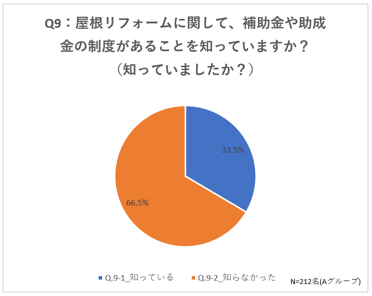 屋根リフォームに関して、補助金や助成金の制度があることを、「知っていた(Q.9-1)」と回答した人は33.5%、「知らなかった(Q.9-2)」は66.5%、という結果になっており、約3人に2人が補助制度の存在を認識していなかったことが明らかとなりました。