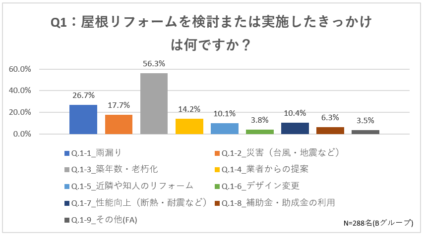 屋根リフォームを検討または実施したきっかけについて、最も多かった理由は「築年数・老朽化(Q.1-3)」で、71.2%と圧倒的多数を占めています。これは、多くの住宅所有者が経年劣化をきっかけとして屋根リフォームを実施した実態を反映しています。