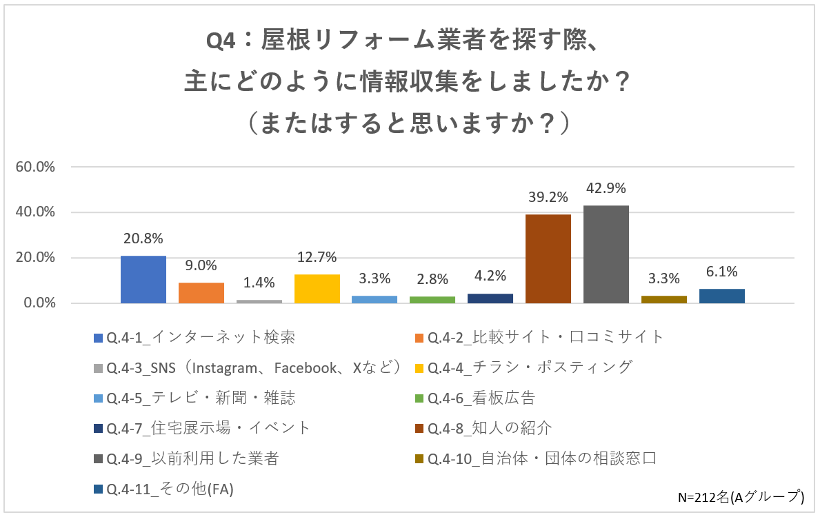屋根リフォーム業者を探す際、最も多く選ばれた情報源として「以前利用した業者(Q.4-9)」が42.9%、次いで「知人の紹介(Q.4-8)」が39.2%となっており、信頼できる人的ネットワークからの情報が圧倒的に重視されていることがわかります。これらは「実際の経験や実績に基づいた情報源」であり、消費者が不安の多い屋根リフォームにおいて、信頼性を最優先している傾向が明らかです。