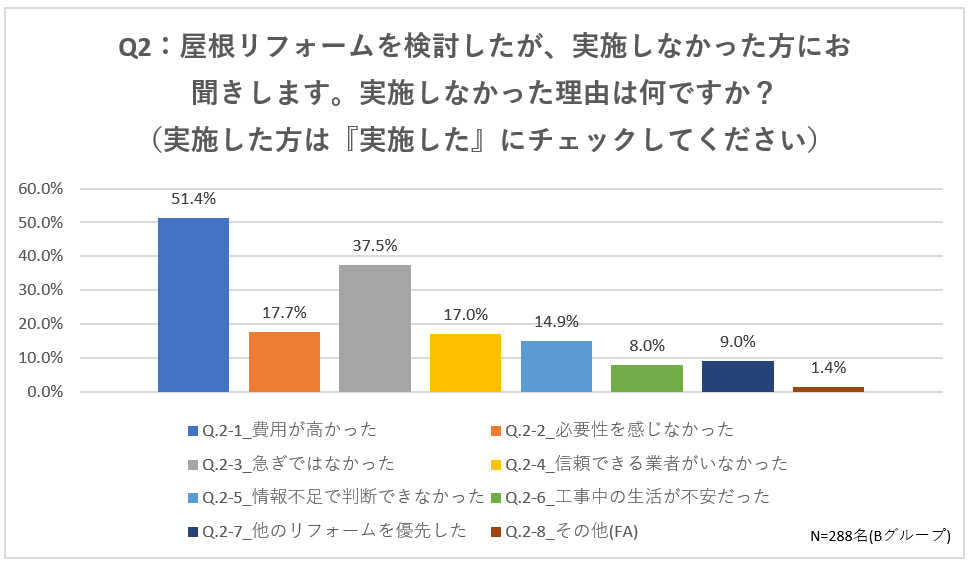屋根リフォームを検討したが、実施しなかった主な理由として、最も多かったのは「費用が高かった(Q.2-1)」と回答した人は51.4%おり、全体の過半数がコストを最大の障壁と感じています。