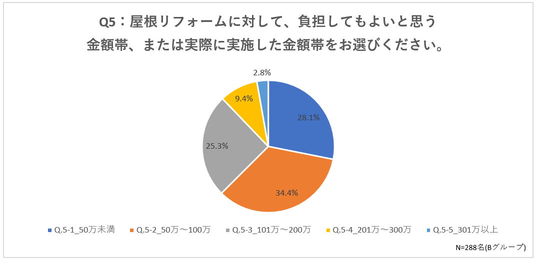 屋根リフォームに対して「負担してもよい」金額帯として最も多かったのは、「50万〜100万円(Q.5-2)」で34.4%を占めました。次いで「50万円未満(Q.5-1)」(28.1%)、「101万〜200万円(Q.5-3)」(25.3%)、が続いており、全体の約9割近くが200万円以下の予算感を想定していることがわかります。