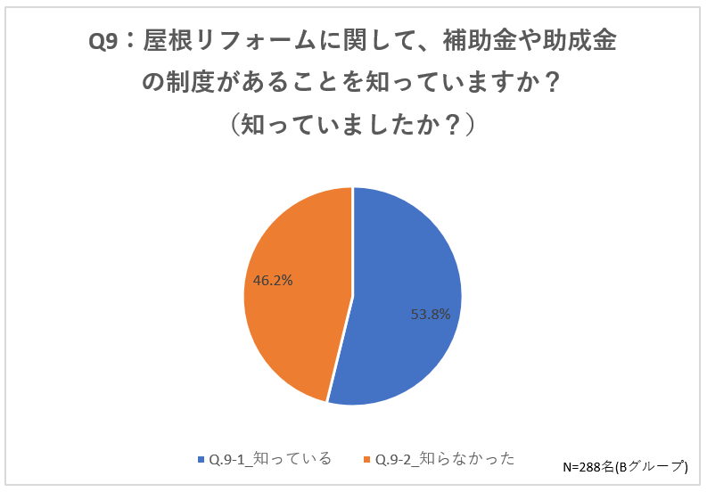 屋根リフォームに関する補助金・助成金制度の認知状況について、「知っている(Q.9-1)」と回答した人は53.8%と半数を上回りました。一方で、「知らなかった(Q.9-2)」とする回答も46.2%と高く、制度の存在が十分に浸透していない実態が浮き彫りとなっています。
