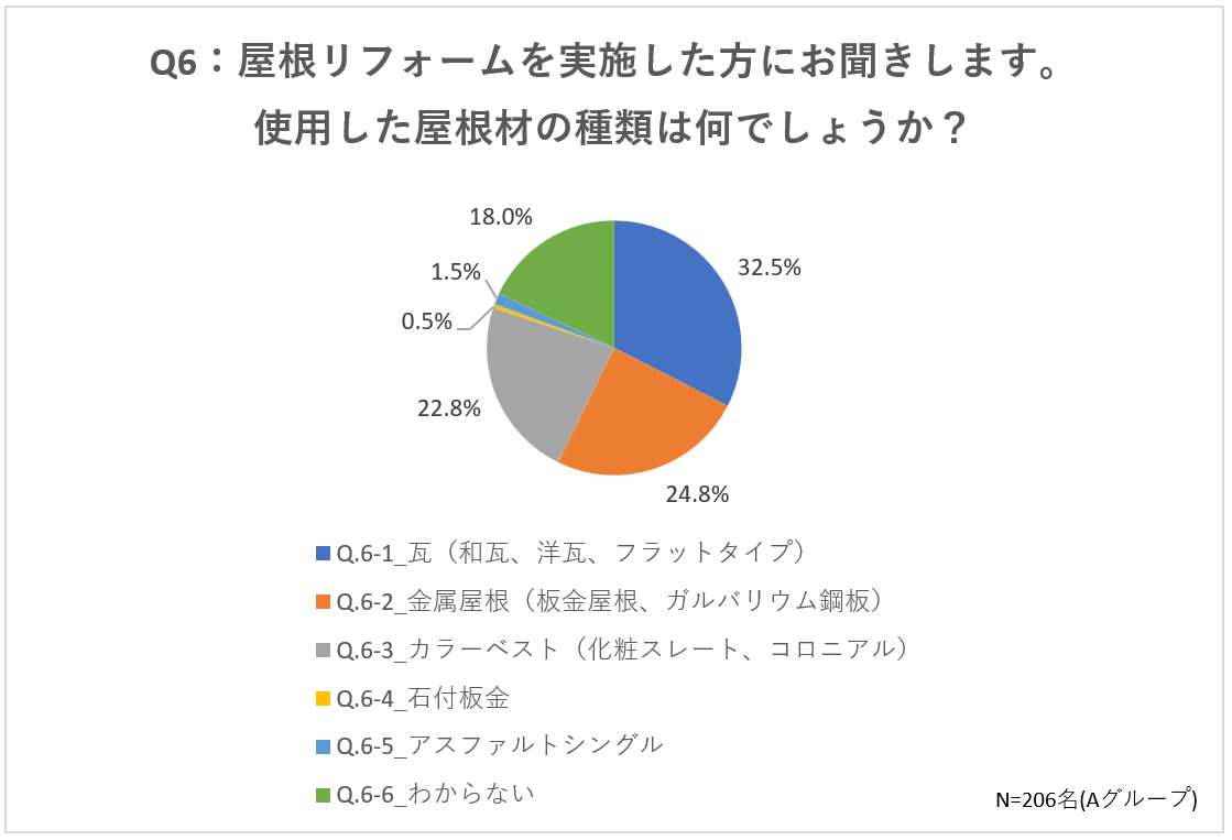 その他の選択肢としては、「アスファルトシングル(Q.6-5)」が1.5%、「石付板金(Q.6-4)」が0.5%と少数にとどまりました。また、「わからない(Q.6-6)」と回答した人も18.0%おり、施工内容に対する理解や関心の差も垣間見えます。