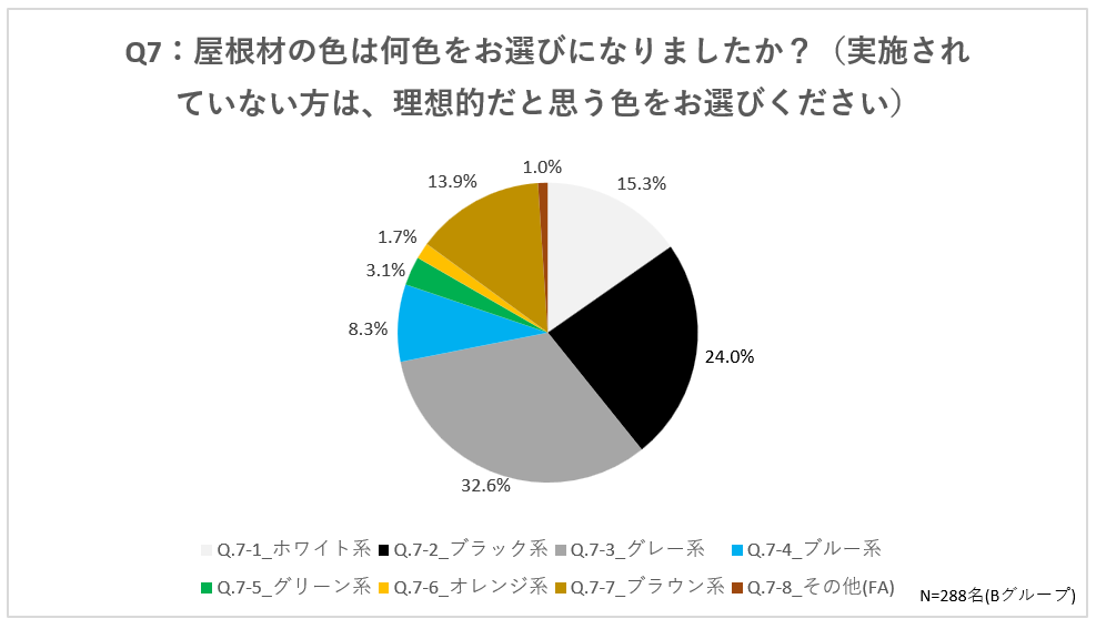 屋根材の色に関する選択では、「グレー系(Q.7-3)」が最も多く32.6%を占めており、全体の約3分の1がこの色調を理想または実際に選んだことがわかります。グレーは汚れが目立ちにくく、周囲の景観にも調和しやすいことから、実用性とデザイン性のバランスを重視する傾向がうかがえます。