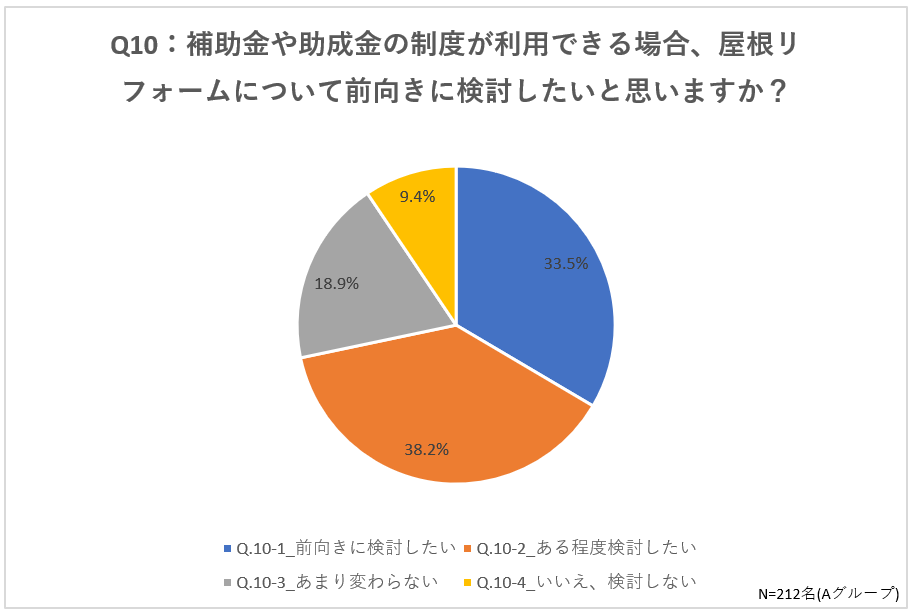 一方で、「あまり変わらない(Q.10-3)」が14.9%、「検討しない(Q.10-4)」が4.9%と、制度の有無にかかわらず屋根リフォームに消極的な層も一定数存在しています。この層に対しては、補助金以外の観点(将来的な資産価値、住環境の改善、災害対策など)からのアプローチが求められます。