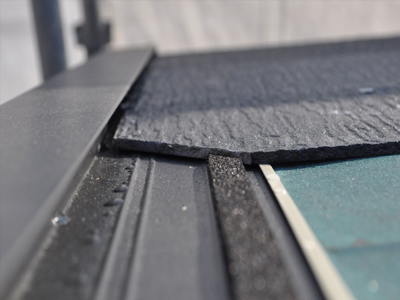 このけらば水切りはデザイン(意匠)としての役目に加えて、風や雨が強い時に化粧スレートの間に入った雨を排水する側溝のような機能を持っています。