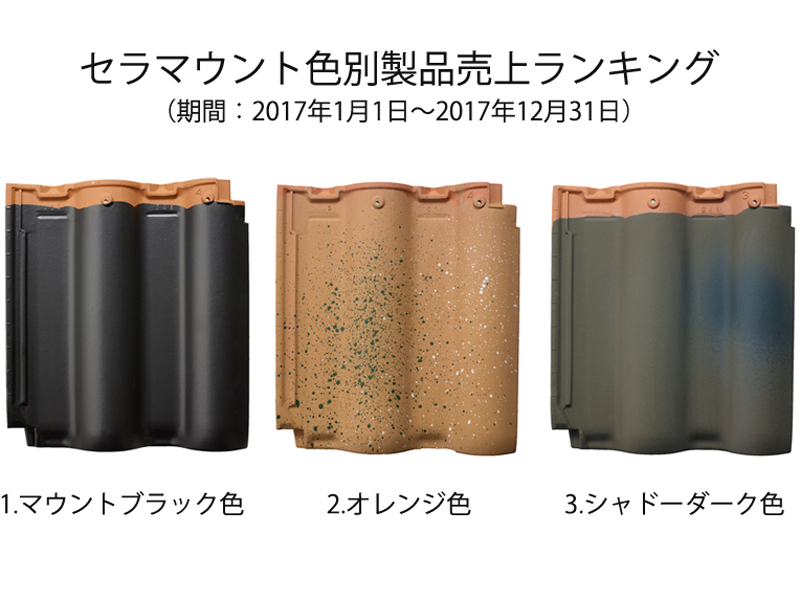 以下は、三州野安株式会社さまのセラマウントと呼ばれる瓦の、色別製品売り上げのランキングです。(期間:2017年1月1日~2017年12月31日)