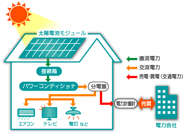 家庭内で利用できる電力は交流電力。太陽電池モジュールで発生した直流電力は 接続箱に集められ、パワーコンディショナを通して交流電力に効率よく変換されます。