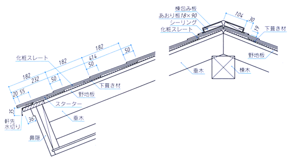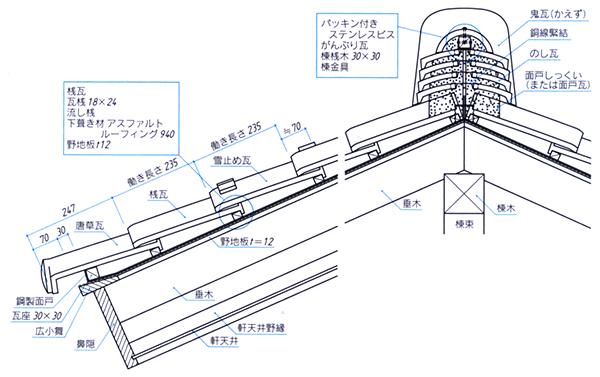 社寺建築に代表されるような、曲線が多く使用された屋根によく使われる構法です。庇などの小さな屋根にも向きます。防水の関係上、勾配は3寸以上が可能と言われています。