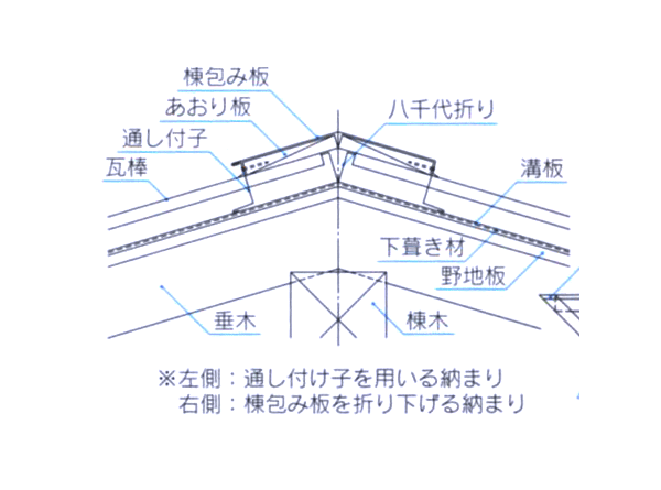 金属屋根の間に心木と呼ばれる木が入っている構法です。特別な加工機器を必要とせず、簡単に施工ができます。瓦棒は角型と丸型どちらも可能です。勾配は0.5寸以上が可能と言われています。
