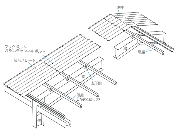 簡易的な建物の屋根や工場などの越屋根に適します。重ねをハゼにしたものもあります。