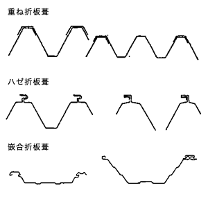 山と谷を作った金属板の山部分を重ねて留める構法です。重ね折板葺は梁の上に直接葺くことが可能で、種々の荷重に耐えることができます。ハゼ板葺は重ね折板葺の防水性能をさらに向上させたもので、外表面にボルトが露出しないので安価かつボルトの錆が出ないという利点があります。また嵌合折板葺はハゼ折板葺の施工性をより向上させた折板です。