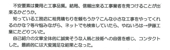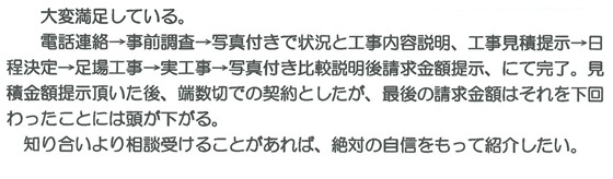 「どこまでも誠実で真面目な工事店」 工事に対するひたむきさと職人としての姿勢に感激したお客さまの声