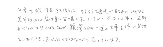 自分は素人だからこそ今回の工事が正解なのか判断することはできませんが、鵜澤様がされる工事を傍で見させてもらって、良い工事だったのでないかと思っております。