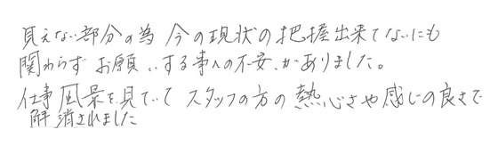 先ほども少しお話にあったのですが、見えない部分だからこそ自分で現状を把握できずにお願いすることに不安がありました。