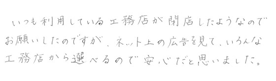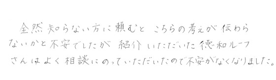 「何よりもお客さまの気持ちを大切に考える工事店」 気持ちを理解し、希望に沿った提案ができる工事店に大満足なお客さまの声