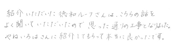 そうですね。追加の部分とか一部は有限会社徳和ルーフさんでは、対応していない工事の部分とかもあったんです。それでも嫌な顔一つせず、紹介してくださりました。その紹介してくださった工事店様にもこちらの希望をしっかりと伝えておいてくれて安心して工事を任せられましたね!