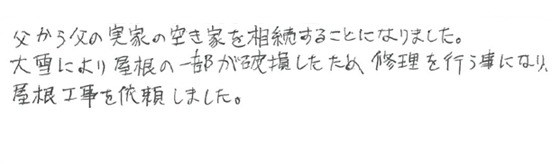 はい、私は広島県に住んでいるのですが、亡くなった父が大事にしていた家が岡山県にあって、その家の屋根が大雪で壊れたということで修理をお願いしました。