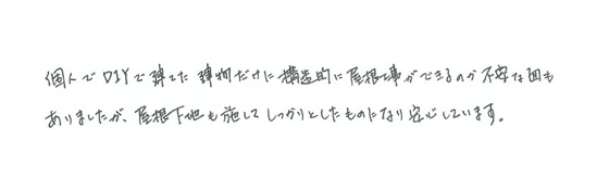 柱とか小屋の主なところは作って、屋根も耐水べニアに防腐剤を塗って仕上げたのですが、所詮素人づくりなので。強風が吹いたり大雨が降ったりしたり、今後のことを考えると屋根だけはしっかりした方が良いなと思って依頼しました。