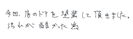 はい、お店のドアの汚れが酷くて、綺麗にしてもらおうと清掃業者に頼んだのですが、汚れが取れなくて。(その業者から)「塗った方が早いですよ」と言われたので、問い合わせしました。