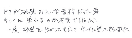 はい。一回塗ってもらって、でも乗らなかったので剥がしてもらって、(今度はドアに直接)塗ってもらったという感じでした。倍の時間をかけてもらうことになったんですが、良心的だなと思いましたね(笑)あと、作業してくれた人がめっちゃ良い人でした(笑)