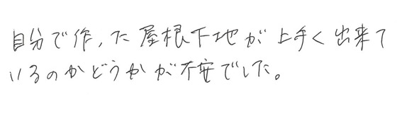 屋根の下地を貼るところまで自分でやってから工事をお願いするという特殊な依頼なので、快く受けてもらえるか不安はありました。途中から引き継ぐのは、やりづらいと思うんですよ。また、自分でやった屋根の下地がうまくできているかということも不安でした。やねいろはに載っているコメントや写真を見て、石原さんはこういった話を飲んでくれそうと思ってお願いしました。