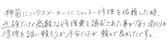 以前、ハウスメーカーにシャッター修理を依頼したんです。<br>けど、原因が分からないと言われてしまいました。<br>それなのに修理費を請求されてしまったんです。<br>なので、今回も同じようなことが起こるかもしれない、という心配はありました。