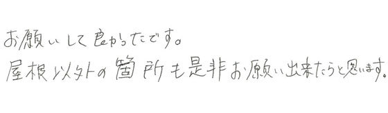 私の仕事の都合もあって時間が合わず、しっかりとお話ができなかったのは残念です。<br>けれど、すごく丁寧に仕事をしていただいたなあ、と思います。<br>現地調査や工事完了後に、報告書を提出してくれました。<br>写真と解説がしっかりとまとめられていて、今の状況・どんな工事をする予定なのか・工事後はどうなったのか、一目瞭然の資料でした。<br>ああいった資料を見せていただけると、安心して工事をお任せできますね。