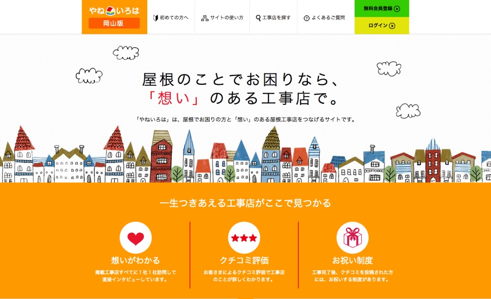 「やねいろは」は当社規定の掲載基準をクリアした、顔が見れる地元の屋根工事店のみ掲載。お客様自身が直接、地元の屋根工事店に依頼が可能です。屋根工事依頼をお考えの方は、ぜひご活用ください。