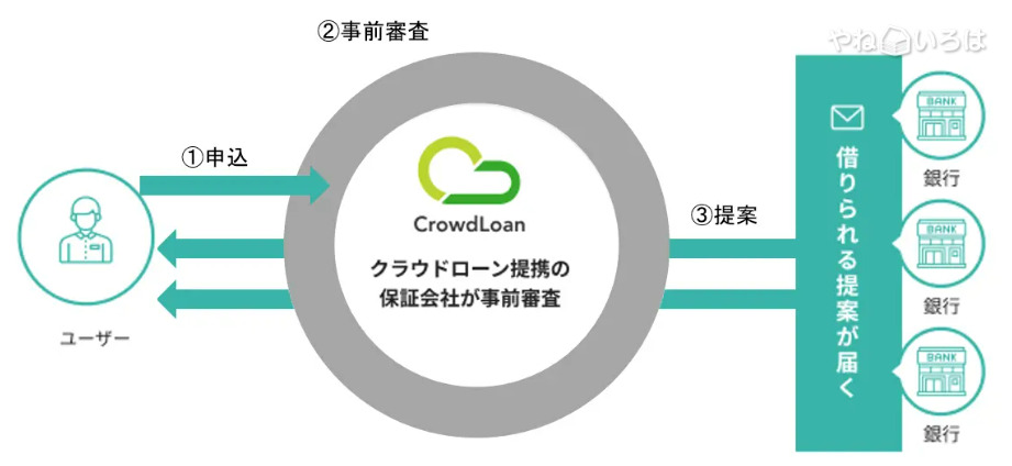 「クラウドローン」は、貸し手である銀行と借り手である個人を、オンラインでつなぐマッチングプラットフォームです。ユーザーは与信審査の情報登録を行うことで、事前に提携先銀行ローンの保証審査を、クラウドローン提携の保証会社が一括で行い、「借りられるローン」の中から選択し申込することができます。