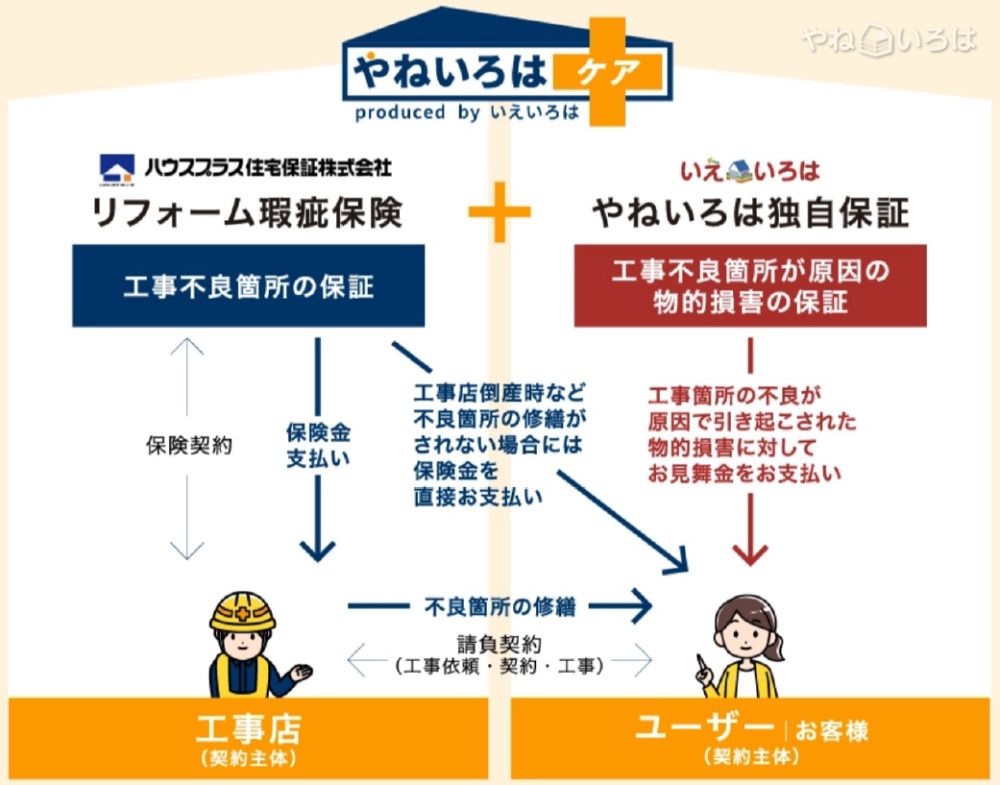 そのような状況を踏まえ、工事店が用意する保証だけでなく、「やねいろは」としてユーザーにさらなる安心を提供していきたいと考え、「リフォーム瑕疵保険」と「やねいろは独自保証」を組み合わせた新しい保証サービス「やねいろはケア」を開始することとしました。