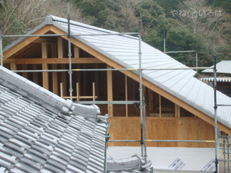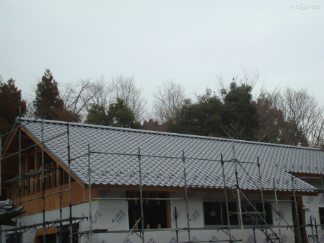 敷地内に母屋があり、その瓦と合わせるため、栄四郎(えいしろう)の和形『銀いぶし瓦』を選ばれました。統一感があっていいですね。今日はあいにく曇り空で、時々みぞれが降っており、良い写真が撮れませんでした…。軒瓦の選び方で、純和風から現代和風まで住まいの表情ががらりと変わるんですよ。