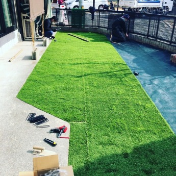 大変ワンちゃんがお好きなご夫婦で今までお庭にウッドチップを敷かれていましたが、風が吹くとホコリがご近所様に飛び、迷惑になるため、今回人工芝を検討され、お電話を頂きました。ホームセンターなどでは安価なものも多くございますが、弊社が提案したEXISランドリアリーターフのサンプルを見て頂き、違いを実感され、ご依頼頂きました。「お庭での過ごし方が変わるよ」と言っていただきました。