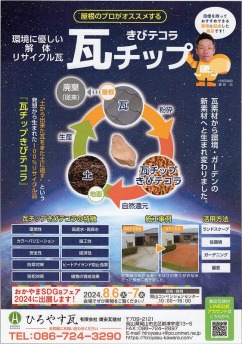 8月6日7日瓦の有効活用を考えるためのおかやまSDGsフェア2024に出展日時 8月6日(火)10時~16時   8月7日(水)10時~16時場所 岡山コンベンショセンター201室不要瓦・廃瓦をどのように活用し価値あるものとして提供し地球温暖化に貢献できるかみなさんの知恵を貸してください当日実物も敷き込み実際使用する雰囲気を演出します