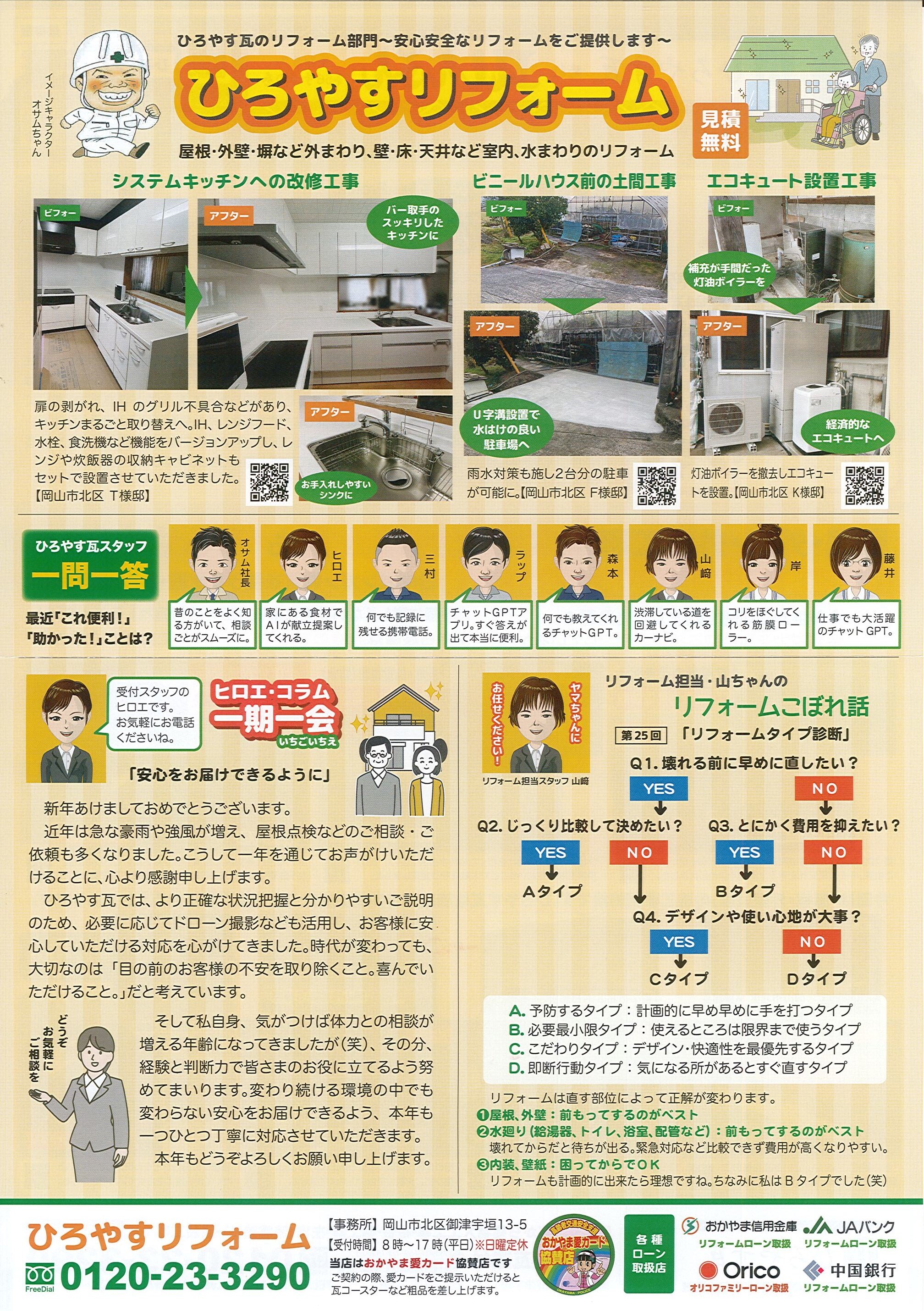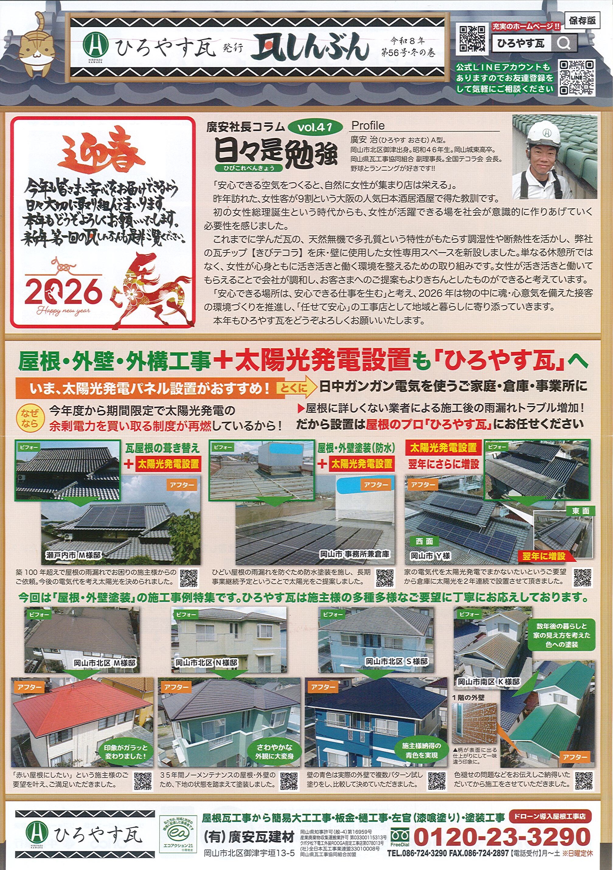 岡山県岡山市北区御津のひろやす瓦(有限会社廣安瓦建材)は、一般住宅や寺社仏閣の瓦屋根を中心とした屋根工事店です。雨漏り修理その他、金属屋根(ガルバリウム鋼板屋根)や雨樋修理、左官工事(漆喰工事)、外壁塗装などを総合的に行っています。地域に根差した工事店でありたいと願う代表が、住宅の不具合相談にも積極的に対応しています。