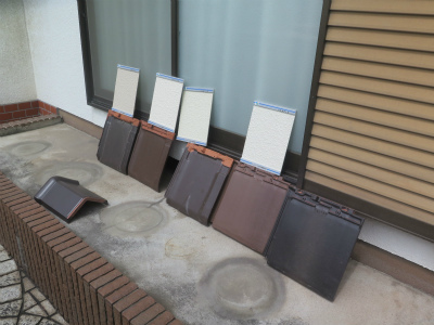 屋根ですからね。ひろやす瓦の強みは、御意向に近い製品を素早く御提案できること。どの屋根材・色・デザインにしようか迷うH様への御提案瓦と塗装のサンプル帳。