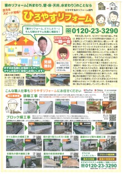 2か月に一度 折り込みチラシさせてもらっています。ひろやす瓦の仕事に対する姿勢・考え方やこの2か月の施工事例をQRコードなどで紹介させてもらっています。今回の裏面は屋根とは関係のないことをあげています。ご覧ください。