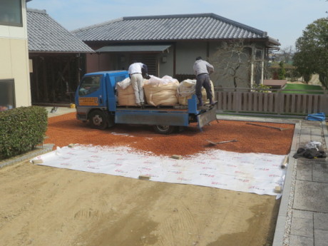 【防草対策】92平米に1,100リットルの20ミリ程度のサイズを敷きます。これで今まで悩んでいた「夏の暑い季節の草抜きから解放される」と喜んでくれています。そして、焼き瓦を破砕し瓦チップにした「きびテコラ」M様「思ったより角が鋭利じゃなくて安全だわ。これなら孫が来ても安心」と安全面にも喜んでもらえました。