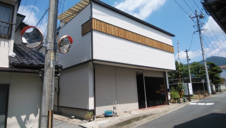 古い店舗の外装が老朽化や強風などによって一部剥がれていました。お店を閉じるのにあたり、看板やパラボラアンテナを撤去して、耐久性が高く、美しい外壁にしてほしいのと2階は住宅の物干しスペースなので、通気を良くしてほしいとのご要望をいただきました。元々の骨組みは鉄骨でしたが、住まいをしたままの改修なので、危険な溶接などは行わず、6cm角の桧を既存の鉄骨にビス止めするという方法を用いて、外装材は軽量な断熱サイディングとしました。通気口はアルミ製のガラリも検討しましたが、経済性や意匠性を考慮し、木製としました。木製の縦板は防腐剤注入材の上に防腐塗装2回塗りとしました。施工地 真庭市