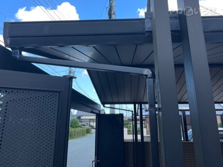 先日の台風で縦樋が外れたと連絡を頂き現地調査に伺いました。幸いバンドの破損で樋の部材は再利用できそうだったため、バンドの数を増やして再度取付けを行いました。また現調時にカーポートの樋も外れてしまっているとの事でしたので、そちらも部品を取り寄せて同時に修理させていただきました。