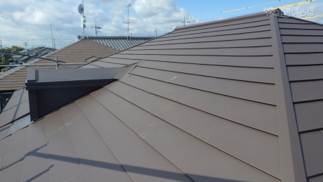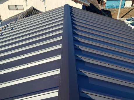 原材料高騰、人手不足、物価高の社会状況下で、この工事費と工期で美しく仕上げてもらい、感謝している。唯一の心配は、既存屋根とガルバリウム鋼板との間に板を挟んでおり、長年月の湿度+温度による劣化や板がない空間部分へ荷重がかかった場合のガルバリウム鋼板への悪影響だが、貸家ももう10年続くかどうかという予想なので、多分大丈夫であろう。工事期間中は離れているので、一度もお茶を出せなかったが、大変良い仕事をしていただいた。今後の外壁塗装も含めて、中山板金工業所にまたお願いしたいと思っている。いろいろ本当に有難うございました。
